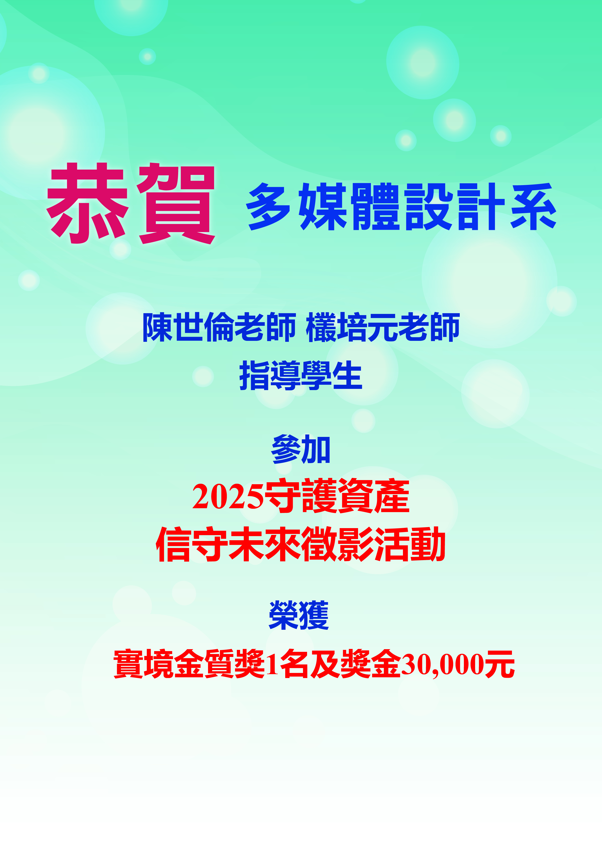 恭賀!! 陳世倫老師及欉培元老師指導學生參加2025多元信託創新獎-守護資產 信守未來 徵影活動,榮獲信託實境組:金質獎1名及獎金30,000元
