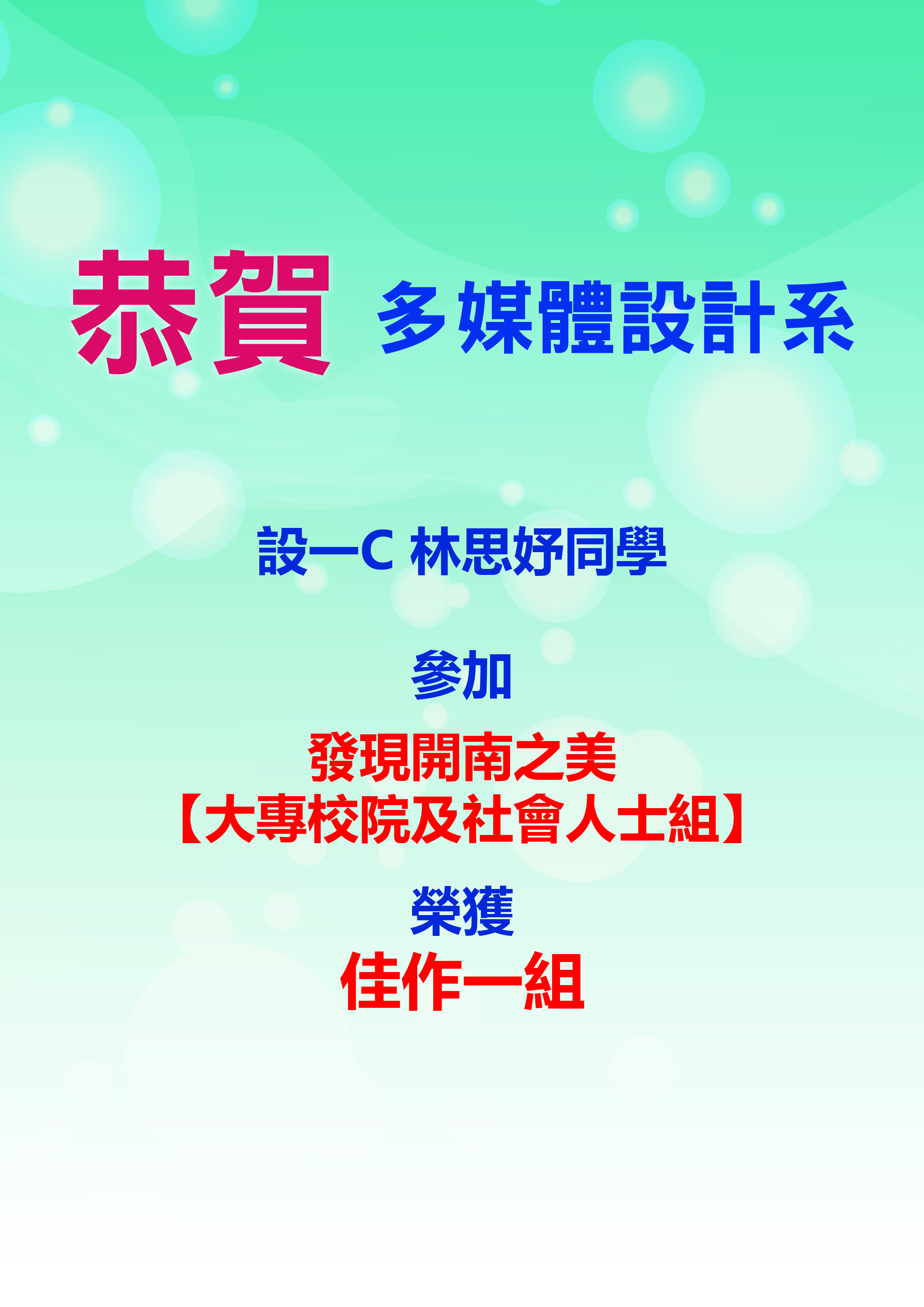 賀!!設一C林思妤同學參加2025發現開南之美【大專校院及社會人士組】,榮獲佳作。
