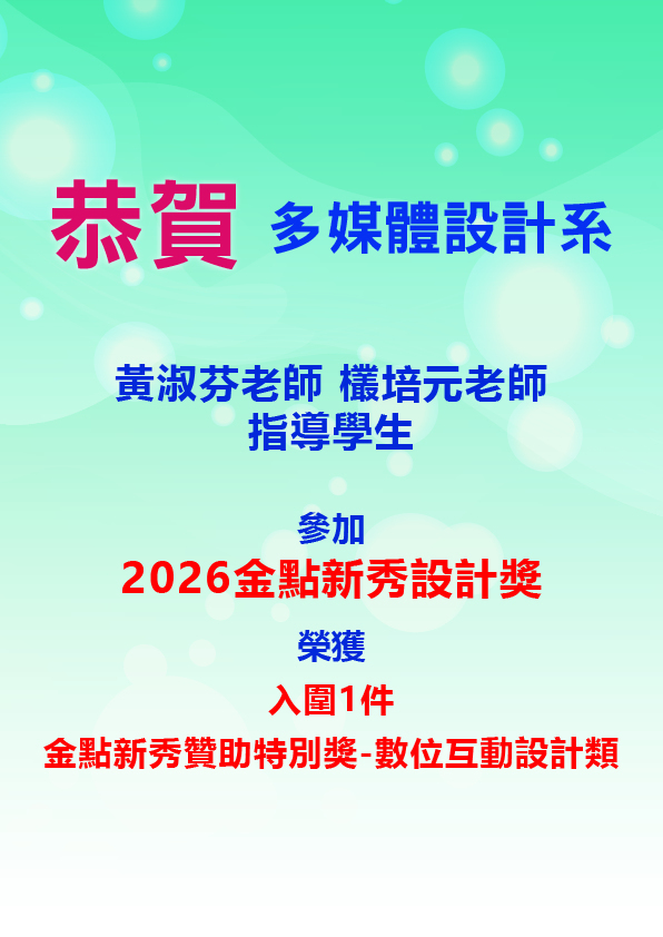 本系今年新一代入圍1件金點新秀贊助特別獎-數位互動設計類,謝謝指導老師指導與付出。