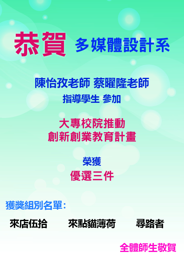 本校3組學生創業團隊榮獲教育部「大專校院推動創新創業教育計畫」-「大專校院創業實戰模擬學習平臺」核定為優選團隊,獲獎件數全國公私立科技大學第一名。每組獲獎補助18萬元,合計54萬元創客金。